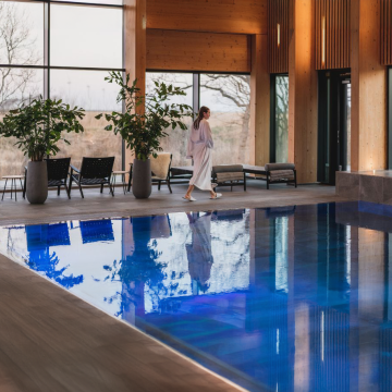 Her kan du varme dig i de stemningsfulde saunaer, mærke velværet brede sig i dampbadene eller tage en dukkert i både indendørs og udendørs pools. Og som kronen på værket: den ikoniske rooftop-pool, hvor udsigten over kornmarker og vestjyske solnedgange gør hvert øjeblik til ren magi.
